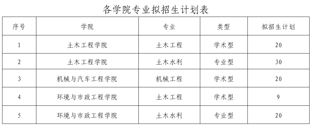 学校2025年面向土木工程、机械工程2个博士学位授权一级学科和土木水利专业博士授权学科点拟招收博士研究生约100人(含各类专项计划),其中全日制学术学位博士生、全日制专业学位博士生分别约50人。各学院专业拟招生计划见下表: